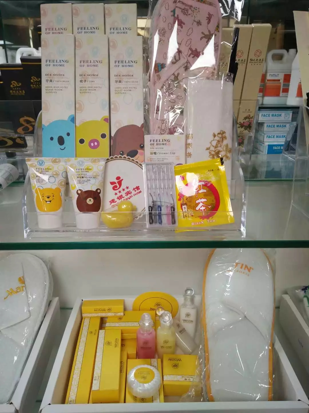 一次性用品:各种材料款式牙刷、牙膏、香皂、拖鞋、洗发液、沐浴露、梳子、浴帽、马桶垫、火柴、纸杯。