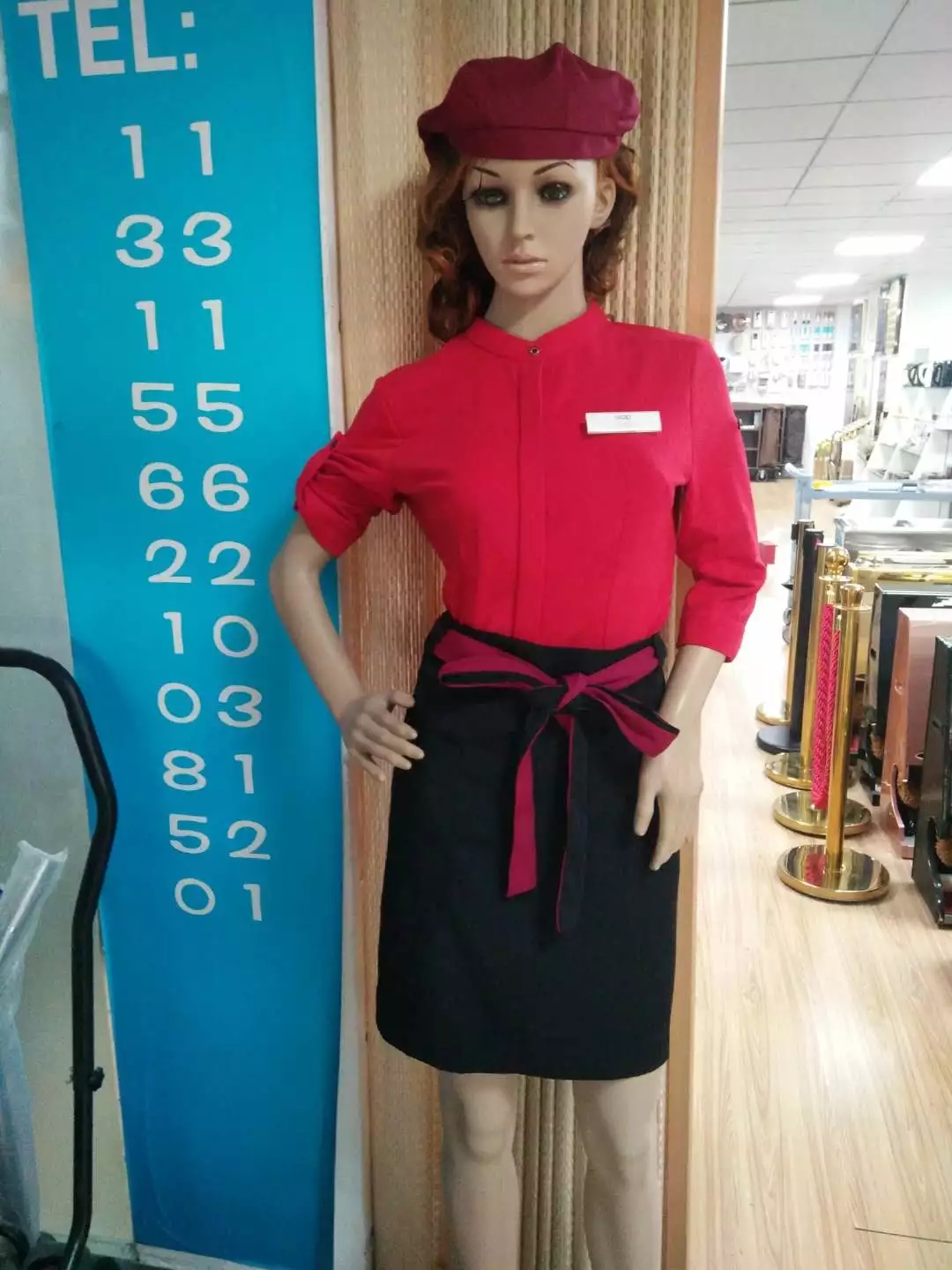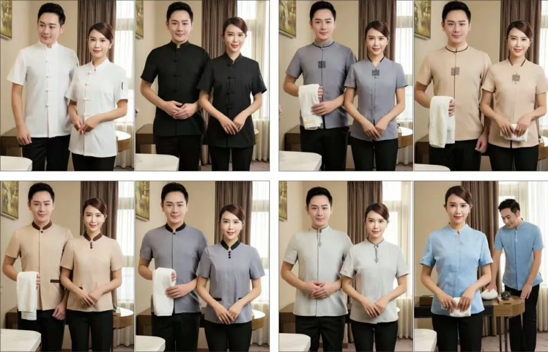 酒店工装:各种面料款式新颖厨师服、多色多尺寸可选,服务员服装、保洁服、经理男女西装衬衣、T恤衫、工程服,支持订做。